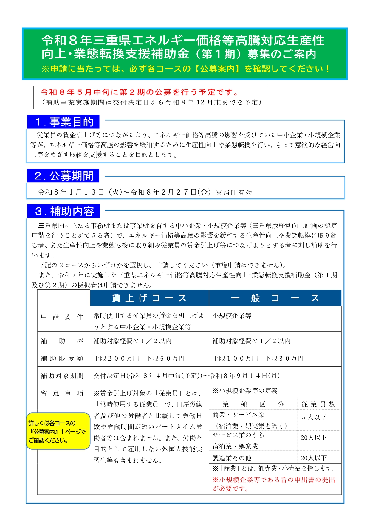 今回は、賃上げコースと一般コースがありますので、詳細は案内チラシ、募集案内をご覧ください。